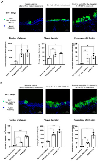 Similarly to Hla treatment, exposure to the ACT toxin resulted in an upturn in EHV-1 infection in the epithelium at 24 hpi (Figure 2B).