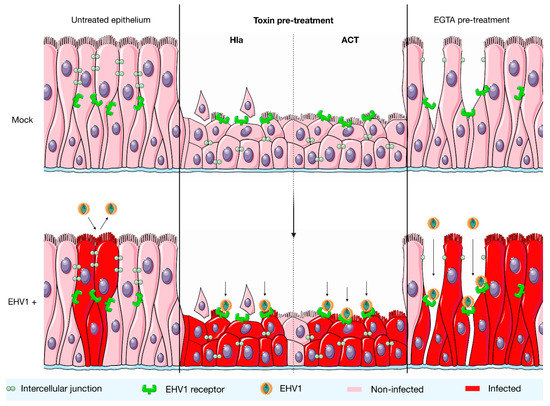 A hypothetical model on how exposure to Hla and ACT toxins might drive subsequent EHV-1 infection in the equine respiratory epithelium. Left: in normal healthy epithelium, EHV-1 replication is restricted due to the fact it targets a receptor located at the basolateral surface of the epithelial cells. This receptor is shielded from the apical environment by cellular junctions. Middle: after treatment with the Hla or ACT toxin, the epithelium undergoes morphological changes, characterized by a decrease in epithelial thickness. It may be that due to a remodeling of the actin cytoskeleton, the EHV-1 receptor becomes available near the apical side of the epithelium. This may explain the more efficient EHV-1 replication. Right: treatment with EGTA was included in this study as a positive control and leads to the disruption of cell junctions. Destruction of epithelial junctions drives EHV-1 infection by providing the virus free access to its basolateral receptor.