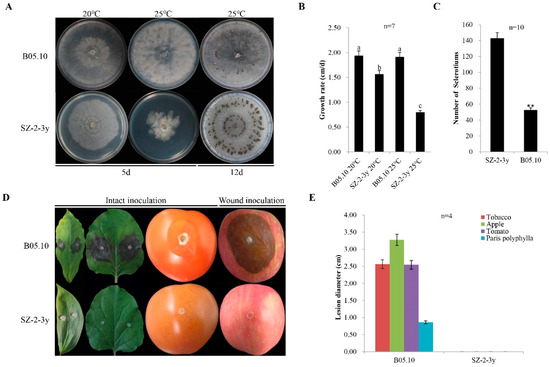 In June 2018, some severely diseased P. polyphylla plants were identified in Sui County, Hubei, China, with obvious grey mold symptoms on their leaves and flowers (Supplementary Figure S1). The SZ-2-3y strain was isolated from P. polyphylla leaves with typical grey mold disease, and identified based on cultural morphology and PCR detection. The rDNA-ITS nucleotide sequence from the mycelium of the SZ-2-3y strain was 99% identical to that of the B. cinerea strains. Meanwhile, a 327 bp specific DNA fragment was amplified using reported B. cinerea-specific primers Bc-f/Bc-r and sequenced, revealing that the SZ-2-3y isolate was indeed B. cinerea (Supplementary Table S1). Compared with B05.10 controls—with 1.9 cm/day after incubation at 20 °C, for 5 days, in darkness—the colony morphology of the SZ-2-3y strain was normal, with a slightly slower growth rate of 1.6 cm/day (Figure 1A,B); furthermore, more sclerotia were produced (143/plate compared with 50/plate for B05.10) after 12 days (Figure 1C). Upon incubation at 25 °C for 4 days, in darkness, the colony morphology of the SZ-2-3y strain was abnormal, mycelia were sparse, and the diameter of colonies was smaller, with an average growth rate of 0.8 cm/day compared with 1.9 cm/day for B05.10. Thus, temperature had a significant effect on SZ-2-3y morphology.