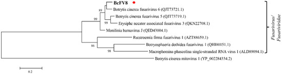Seven fusariviruses have been found in B. cinerea strains, and the fusarivirus identified in this study was designated Botrytis cinerea fusarivirus 8 (BcFV8). The obtained 3074 nt sequence of BcFV8 has been submitted to NCBI under GenBank accession number OL321741 (Supplementary File S2). BcFV8 encodes a partial RdRp sequence that shares the highest identity (87.2%) with its homolog in BcFV6, and it clusters in the same group as other members in the Fusarivirus genus (Supplementary Table S2, Figure 2).