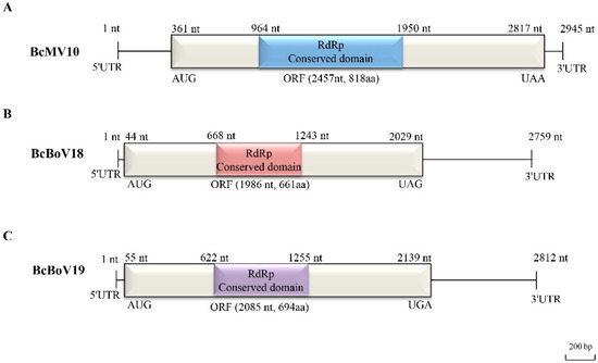 Full-length genome structures of: (A) BcMV10; (B) BcBoV18; and (C) BcBoV19. Each contains one open reading frame (ORF) flanked by two untranslated regions (UTRs) at 3′- and 5′- termini and RdRp conserved domain, which are indicated by an open bar and black lines, and different corresponding colour boxes, respectively.