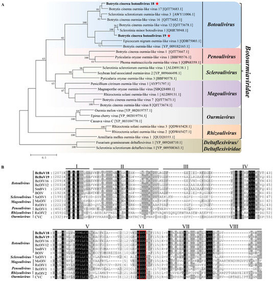 Phylogenetic tree depicting the relationships and: (A) multiple alignments of predicted RdRp aa sequences from; Botrytis cinerea botoulivirus 18, Botrytis cinerea botoulivirus 19 (indicated in the bold letters with red pentagrams)_are clustered into the genus Botoulivirus. (B) BcBoV18 and BcBoV19 (indicated with bold letters) in this study with members of Botoulivirus, Penoulivirus, Scleroulivirus, Magoulivirus, Ourmavirus and Rhizoulivirus in the Botourmiaviridae family. The conserved RdRp motifs are indicated using Roman numerals from I to VIII for BcBoV18 and BcBoV19. The red box indicated the conserved GDD motifs.