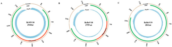 Profile distribution of viral reads along the full-length genomes of BcMV10, BcBoV18 and BcBoV19. Genome sequences (indicated with light brown colours), ORFs (indicated with light green colours), RdRp domains (indicated with red colours) and RNA read depth (indicated with light blue colours) of: (A) BcMV10; (B) BcBoV18; and (C) BcBoV19 are shown as circle graphs with different corresponding colours.