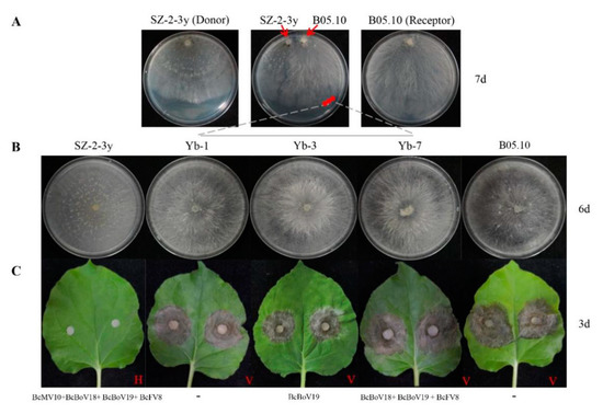 Pairing culture experiments between strains SZ-2-3y and B05.10 (SZ-2-3y/B05.10) were carried out (Figure 7A). Single-strain cultures of SZ-2-3y and B05.10 served as controls. Mycelial derivative isolates were obtained from colonies of B05.10 as recipients, and these (Yb-1, Yb-2, Yb-3, Yb-7, Yb-8 and Yb-11) grew almost the same as the B05.10 parental isolate (Figure 7B). When the tobacco leaves were inoculated with the three derivative isolates, they exhibited virulence similar to that of the B05.10 strain (Figure 7C). RT-PCR analysis showed that only BcBoV19 in Yb-3, Yb-8, and mixtures of BcBoV18, BcBoV19 and BcFV8 in Yb-7, were positive, while negative detection was observed for Yb-1, Yb-2 and Yb-11 from B05.10 derivatives (Table 2). Hyphal contact transmission experiments suggested that BcBoV19 alone, or the combination of BcBoV18, BcBoV19 and BcFV8 mycoviruses, could be successfully horizontally introduced into B05.10 with no apparent effect on growth, colony morphology or pathogenicity. However, the derivate with BcMV10 could not be obtained in multiple experimental replicates.