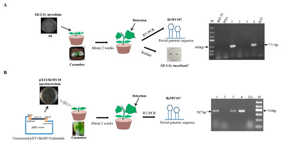 Schematic diagram of wound inoculation of cotyledons of cucumber plants with SZ-2-3y and RT-PCR detection of the BcMV10 sequence in new leaves of ‘Cuiyu’ plants inoculated with: (A) SZ-2-3y mycelia (M = Marker III, B05.10 mycelia and blank PDA-inoculated plants as negative controls; (B) agro-infiltration with the pXT1/BcMV10 clone (Ck- = pXT1-inoculated plants as negative controls; M-Marker II; Lanes 1–4, new leaves from four ‘Cuiyu’ cv. cucumber plants inoculated with SZ-2-3y mycelia (A) and pXT1/BcMV10 (B), respectively.