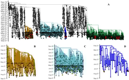 Phylogenetic relationship of SARS-CoV-2, 2019–2021. Global context tree highlighting the different variants: (A) Gamma (gold), Alpha (teal), Mu (blue), and Delta (green). Red diamonds indicate the viruses obtained in this study. The relationships of the different variants detected in the studied patients were magnified into (B) Gamma, (C) Alpha, and (D) Mu. Yellow circles indicate viruses isolated in Mexico. Red circles indicate ambulatory vaccinated patients. Red squares indicate hospitalized vaccinated patients. Pink triangles indicate hospitalized non-vaccinated patients. Sequences used in this analysis were downloaded from the Global Initiative for Sharing All Influenza Data (GISAID) database.