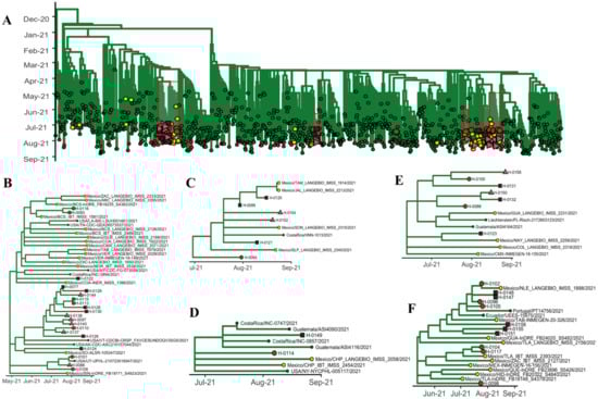 Delta variant phylogenetic relationship. Phylogenetic tree showing the analyzed Delta viruses and the distribution of the obtained sequences (A). Red boxes indicate posterior magnification of the analyzed clades, which are the following: the largest clade involving 20 of the generated sequences (B) and the minor clades in which the obtained sequences grouped with other Mexican isolates (C–F). Yellow circles indicate viruses isolated in Mexico. Red circles indicate ambulatory vaccinated patients. Red squares indicate hospitalized vaccinated patients. Pink triangles indicate hospitalized non-vaccinated patients. Sequences used in this analysis were downloaded from the Global Initiative for Sharing All Influenza Data (GISAID) database.