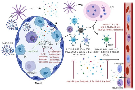 Innate and adaptive immune cells involved in SARS-CoV-2 infection, as well as the different chemokines and cytokines released and their inhibitors. SARS-CoV-2 binds ACE2 receptor on epithelial cells (ECs) and on macrophages (MΦ) of the alveoli. This triggers the release of cytokines and chemokines that attract more immune cells to the injured lung. Upon infection, activated DCs migrate to the lymph node (LN), where they activate T- and B-lymphocytes, which will further release pro-inflammatory mediators that exacerbate the infection. Several drugs currently used on patients or being tested in clinical trials target the various chemokines and cytokines responsible for the cytokine storm in COVID-19, including IL-6 inhibitors, INF, IL-1β inhibitors, JAK inhibitors, and IL-17 antibodies.