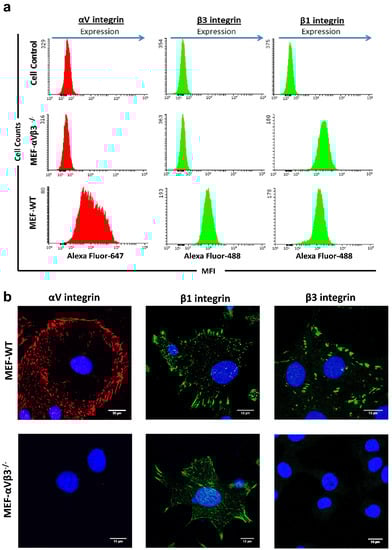 MEFs deficient for αVβ3 (MEF-αVβ3−/−), as well as the respective wild-type (MEF-WT) cell lines were characterized for their integrin expression profile by flow cytometry and confocal laser scanning microscopy. First, flow cytometry analysis was performed to confirm loss of αVβ3 integrin expression in the integrin deficient cell line as well as to measure the level of integrin expression in the MEF-WT. The MEF-WT expressed high amounts of αV and β3 integrin subunits, whereas the MEF-αVβ3−/− showed complete absence of both, the αV and β3 integrin subunits (Figure 1a). We also measured the levels of β1 integrin subunit, which is widely expressed in murine fibroblasts [32,45]. The β1 integrin subunit could be detected on the cell surface of the MEF-WT as well as MEF-αVβ3−/− indicating that other integrin heterodimers are present on the cell surface of MEF-αVβ3−/− (Figure 1a). Expression levels of αV, β1 and β3 integrin subunits reached more than 99% in the MEF-WT, contrary to the MEF-αVβ3−/−, which demonstrated total absence of αV and β3 integrin subunit expression whereas high amounts of β1 integrin subunit were still expressed (>99%). Ablation of αVβ3 in the MEF-αVβ3−/− had no influence on cell viability when compared to the MEF-WT (Figure S1a). Chinese hamster ovary (CHO) cells transfected with either the mouse αV (CHO-αV+/+) or the mouse β3 (CHO-β3+/+) integrin subunit expressed high amounts of the respective integrin subunit (Figure S2a). In order to confirm these findings and to determine the integrin subcellular localization, confocal laser scanning microscopy was applied. As demonstrated in Figure 1b, if expressed, integrins are globally distributed over the cell membrane in both MEF-WT and MEF-αVβ3−/− (Figure 1b). In accordance with the flow cytometry analysis, the MEF-WT expressed significant amounts of αV, β1 and β3 integrin subunits, whereas MEF-αVβ3−/− showed to solely express the β1 integrin subunit (Figure 1b). The integrin subcellular localization as well as their expression patterns are in accordance with what was previously described [32,46]. Similarly, high amounts of both αV and β3 integrin subunit in the CHO-αV+/+ and CHO-β3+/+ cells were visualized by confocal microscopy as shown in Figure S2b.