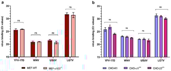 Flavivirus binding to the cell surface of (a) MEF-WT and MEF-αVβ3−/− and (b) CHO-K1, CHO-αV+/+ and CHO-β3+/+. Cells were infected with YFV-17D, WNV, USUV or LGTV at a MOI of 10, placed on ice to allow virus binding to the cell surface but no internalization. After 1 h, cells were extensively washed, monolayers harvested and the amount of virus bound to the cell surface was determined by RT-qPCR. Virus binding values are expressed in cycle threshold (Ct) values. Three independent experiments were performed in triplicate each. Bars represent mean Ct values and error bars represent the standard deviation (means ± standard deviation). Statistical analysis: Mann–Whitney test; ns: not significant (p > 0.05).