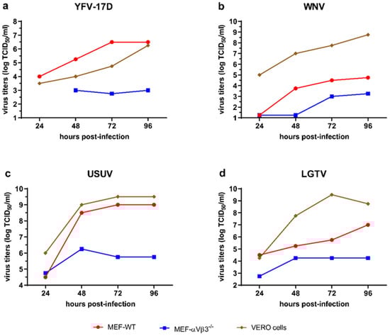 Replication kinetics of (a) YFV-17D, (b) WNV, (c) USUV and (d) LGTV in MEF-WT, MEF-αVβ3−/− and Vero 76 cells. Cells were inoculated with these flaviviruses at a MOI of 0.1 and supernatants were harvested at 24, 48, 72 and 96 h post inoculation. Values represent virus titers determined by TCID50 in Vero 76 cells over a period of 4 days post-infection.