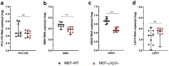 Internalization of (a) YFV-17D, (b) WNV, (c) USUV and (d) LGTV by MEF-WT and MEF-αVβ3−/−. Cells were inoculated with different flaviviruses on ice for 1 h to allow virus binding but not internalization. Thereafter, cells were extensively washed and shifted to 37 °C for 30 min to allow virus internalization. Cell monolayers were treated with acidic glycine (pH 2.5) for 2 min to inactivate non-internalized virus. Monolayers were harvested, the amount of internalized virus was determined by RT-qPCR and expressed as copy numbers per microliter (log transformed). Three independent experiments were performed in triplicate each. Dot plots represent each individual replicate from the three independent experiments. Statistical analysis: Unpaired Student’s t-test with Welch’s correction; (***) p ≤ 0.001; (****) p ≤ 0.0001; ns: not significant (p > 0.05).