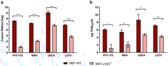Replication analysis of YFV-17D, WNV, USUV and LGTV in MEF-WT and MEF-αVβ3−/− cells 48 h post inoculation showing (a) viral RNA load and (b) virus titers. Cells were seeded into 12-well plates and inoculated with different flaviviruses at a MOI of 10. After one hour, monolayers were extensively washed and shifted to 37 °C for 48 h. Supernatants were harvested, viral RNA isolated and RT-qPCR was performed to determine viral RNA yields. The amount of virus genome is expressed as copy numbers per microliter (log transformed). End-point determination of virus titers were calculated using the Spearman–Kärber method and expressed as TCID50 log values. Three independent experiments were performed in triplicate each. Bars represent mean values and error bars represent the standard deviation (mean ± standard deviation). Statistical analysis: Unpaired Student’s t-test with Welch’s correction: (*) = p ≤ 0.05, (**) = p ≤ 0.01, (***) = p ≤ 0.001 and (****) = p ≤ 0.0001.