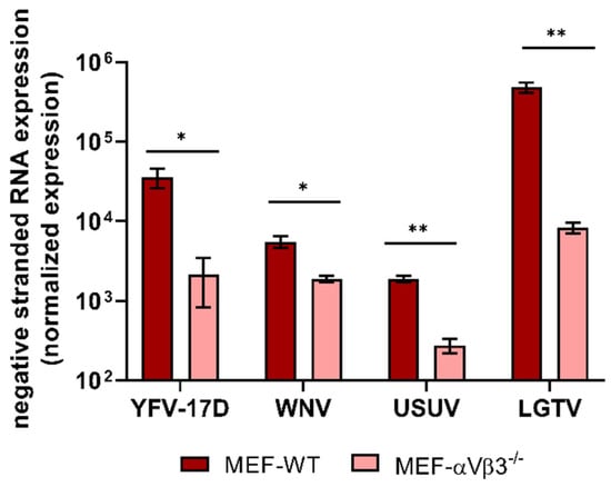 Relative quantification of flavivirus antigenome (negative-strand) RNA in MEF-WT and MEF-αVβ3−/− cells. Cells were infected with YFV-17D, WNV, USUV and LGTV at a MOI of 10. After 48 h post inoculation, monolayers were washed, harvested, lysed and total RNA was extracted. RT-qPCR was performed to quantify the amount of negative-strand RNA. The levels of flavivirus negative-strand RNA were normalized against beta-actin, a housekeeping gene, and the relative gene expression was calculated by 2^−ΔΔCt method. Levels of flavivirus negative-strand RNA were expressed as fold amplification in relation to the housekeeping gene. Three independent experiments were performed in triplicate each. Bars represent mean values and error bars represent the standard deviation (mean ± standard deviation). Statistical analysis: Unpaired Student’s t-test with Welch’s correction: (*) = p ≤ 0.05 and (**) = p ≤ 0.01.