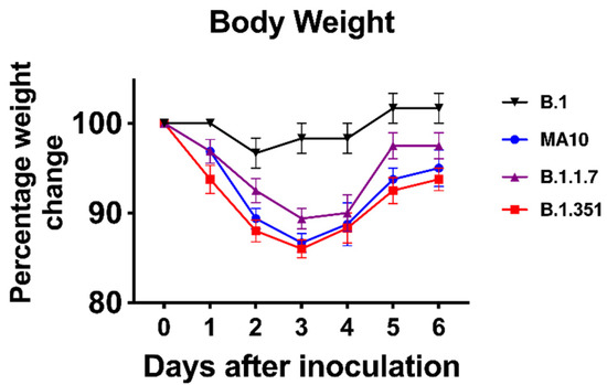 Analysis of body weight in C57BL/6 mice following SARS-CoV-2 infection. Six-week-old C57BL/6 mice were inoculated intranasally with 105 plaque-forming units (PFU) of SARS-CoV-2 variants (n = 8–10 mice per group). Percentage of initial weight for SARS-CoV-2-infected mice over 6 days. Values are the mean ± SEM.