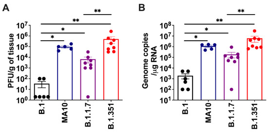 Replication of SARS-CoV-2 variants in the lungs. Six-week-old C57BL/6 mice were inoculated intranasally with PBS (mock) or 105 plaque-forming units (PFU) of SARS-CoV-2 variants. Groups of 5–8 mice were euthanized at 3 days after infection and lungs were collected. Virus titers were analyzed in the lungs by (A) plaque assay and (B) qRT-PCR. The data are expressed as PFU/g of tissue or genome copies/μg of RNA. Each data point represents an individual mouse. *, p < 0.05; **, p < 0.001.