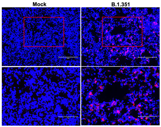 Detection of SARS-CoV-2-infected cells in the lungs of B.1.351-infected mice. Lung sections from mock- and B.1.351-infected mice (day 3 after infection) were stained for SARS-CoV-2 nucleocapsid protein. Representative immunostaining images showing the presence of SARS-CoV-2 nucleocapsid protein (red) in the B.1.351-infected mice. Nuclei are stained with DAPI (blue). The boxed areas in the top row of panels (20×) are enlarged in the bottom row of panels (40×). The photomicrographs shown are representative of the images obtained from five animals.
