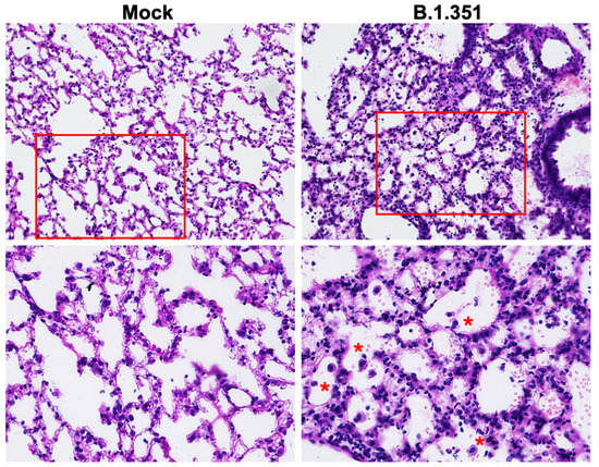Histopathological analysis of B.1.351-infected lungs. Hematoxylin and eosin (HE) staining of lung sections from mock- and B.1.351-infected mice on day 3 after infection. Lung sections from infected mice showed multifocal lesions with abundant leukocyte infiltration (red asterisks), hemorrhages and interstitial thickening. The boxed areas in the top row of panels (20×) are enlarged in the bottom row of panels (40×). The photomicrographs shown are representative of the images obtained from five animals.