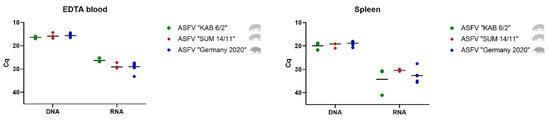 Viral genome loads in EDTA blood and spleen represented by Cq values in qPCR and RT-qPCR. Boars infected with ASFV “KAB 6/2” are depicted by green dots, ASFV-“SUM 14/11”-infected animals by red squares, and ASFV-“Germany 2020”-infected wild boar by blue stars. The mean Cq value per group is represented by a black line.
