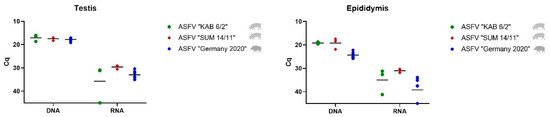 Detection of viral DNA and mRNA in testicular and epididymal samples of mature domestic pigs infected with ASFV “KAB 6/2” (green dots), ASFV “SUM 14/11” (red squares) and prepubescent wild boar infected with ASFV “Germany 2020” (blue stars). The mean Cq value per group is depicted by a black line.