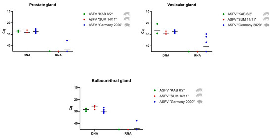 Viral genome and mRNA load in the prostate, vesicular, and bulbourethral glands in ASFV “KAB 6/2”- (green dots) and ASFV “SUM 14/11”-infected domestic pigs (red squares) and ASFV “Germany 2020”-infected wild boar (blue stars). The mean Cq value per group is displayed by a black line.
