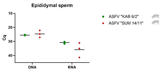 Epididymal sperm was collected only from mature boars infected with ASFV “KAB 6/2” and “SUM 14/11”, and tested for the presence of viral DNA, mRNA and infectious virus (Figure 4, Table 2). In both groups, moderately high amounts of viral DNA and low amounts of viral mRNA were detected (Figure 4). Viral DNA was found with mean Cq values of 25.48 (ASFV “KAB 6/2”) and 24.69 (ASFV “SUM 14/11”), whereas viral mRNA was present with Cq values of 30.78 (ASFV “KAB 6/2”) and 35.84 (ASFV “SUM 14/11”). All tested epididymal sperm samples were revealed to be infectious by virus isolation (Table 2).