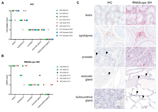 Semiquantitative results of: (A) immunohistochemistry (IHC); (B) RNAScope in situ hybridization (ISH) of male reproductive organs from ASFV “KAB 6/2”, “SUM 14/11”and “Germany 2020”-infected pigs; (C) representative images showing IHC for anti-p72 capsid protein (red-brown signal) and RNAScope ISH (red signal) for anti p72 mRNA of ASFV-infected male reproductive organs. Arrowheads indicate positive cells in less affected accessory sex glands. Tissue sections were counterstained with Mayer’s Hematoxylin.