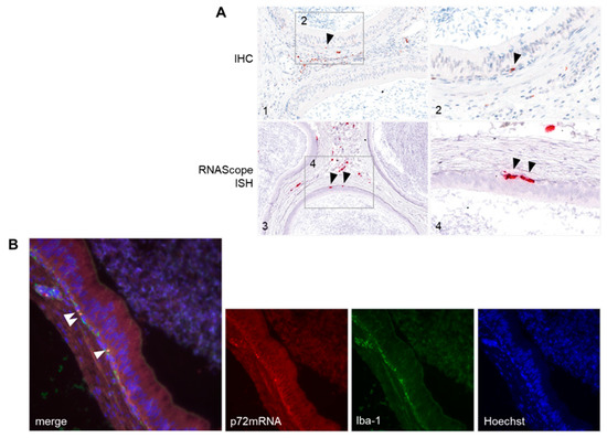 (A) Immunohistochemistry (IHC) using a rabbit polyclonal antibody against p72 and RNAScope in situ hybridization (ISH) using a probe against p72 mRNA performed on ASFV-infected epididymis-indicating halo cells (black arrows). Tissues were counterstained with Mayer’s hematoxylin. (B) Dual RNAScope in situ hybridization (ISH) and Iba-1 immunofluorescence using a mRNA probe against p72 and a rabbit polyclonal antibody against Iba-1. White arrowheads indicate double staining of ASFV p72mRNA and Iba-1 expression in epididymal halo cells. Tissue sections were counterstained with Hoechst.