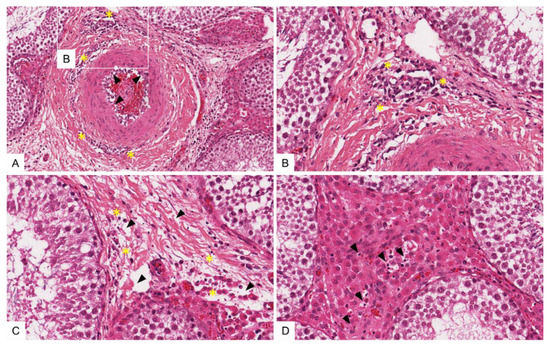 Tissue sections of an ASFV-infected swine testis stained with hematoxylin-eosin. (A) Testicular artery showing diffusely activated endothelium (arrow). Vasculitis and perivasculitis of small caliber vessels (rectangle above) expand to the tunica adventitia of the artery (asterisk). (B) Magnification of (A). Small caliber vessels with activated endothelium, and moderate intramural and perivascular infiltration by mononuclear cells admixed with multiple apoptotic/necrotic cells (asterisk). (C) Multifocal single-cell apoptosis/necrosis of cells (asterisk) in mildly edematous testicular stroma (arrows) adjacent to an unaffected seminiferous tubule. (D) Focal area showing apoptosis/necrosis of multiple cells (arrows) between normal seminiferous tubules.