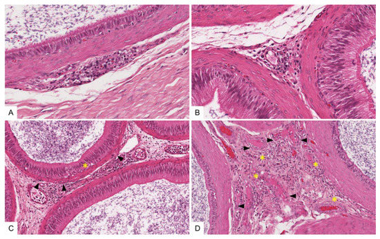 Tissue sections of ASFV-infected swine epididymis, hematoxylin and eosin stain. (A,B) Moderate necrotizing vasculitis and perivasculitis of a small caliber vessel adjacent to unaffected epididymal ducts. (C) Fibromuscular epididymal tissue showing multifocal to coalescing necrotizing inflammation. Smooth muscle cells surrounding epididymal ducts and the basal compartment of the duct epithelium are mildly infiltrated by mononuclear cells (arrows) with occasional single cell apoptosis/necrosis (asterisk). (D) Moderate multifocal necrotizing vasculitis affecting small caliber vessels (arrows) and diffuse mononuclear infiltration of fibromuscular tissue admixed with abundant apoptotic/necrotic cells (asterisk).