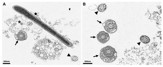 EM Micrographs of sperm from boar. (A,B) show epoxy resin embedded in vitro inoculated sperm cut in different directions (asterisk). Arrows show the cross section of the head and middle part of a sperm cell, arrowheads show the cross section of the flagellum and the star indicates a longitudinal section of the flagellum. The asterisk represents ASFV particles.