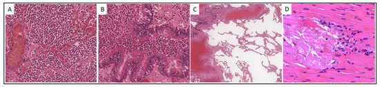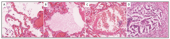 Case 10. A 61-year-old male was admitted to the hospital on 23 October 2020, with a diagnosis of COVID-19 (U07.1). On October 24, the patient’s biological death was recorded from acute respiratory failure, which developed due to total bilateral polysegmental pneumonia with a hemorrhagic component caused by SARS-CoV-2. Histological examination of the Pt 10 lungs revealed signs characteristic mainly of the exudative phase of DAD: vascular congestion and capillary stasis (Figure 3A), intra-alveolar edema (Figure 3B), hyaline membranes (Figure 3B,C), intraalveolar extravasates, and cellular detritus (Figure 3C), and desquamation of the alveolar and bronchiolar epithelium (Figure 3D).