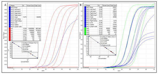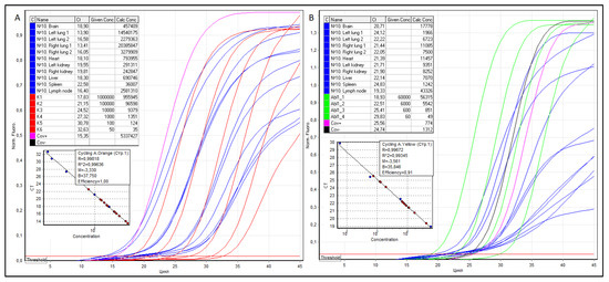 As shown in Figure 2, in the presence of 2274 to 30,990 copies of ABL1 cDNA in the studied samples, except for the myocardium, no SARS-CoV-2 RNA was detected anywhere. The true copy numbers of SARS-CoV-2 and ABL1 RNAs in the myocardium were 383,655 (R2 = 0.99980, efficiency–1.00) and 30,990 (R2 = 0.99929 and efficiency–0.90) copies, respectively. According to the formula NSARS-CoV−2/NABL1 × 100, SARS-CoV-2 VL in the myocardium was 1238 copies of SARS-CoV-2 RNA per 100 copies of ABL1.