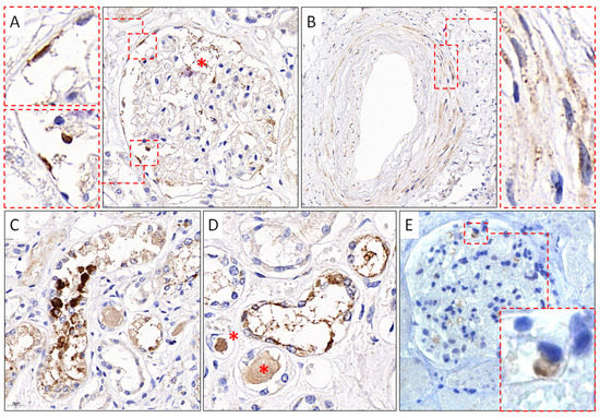 Results of IHC study using mAb against SARS-CoV-2 S-protein. (A). SARS-CoV-2–positive staining of endothelial cells, cells of the capillary network (red asterisk), and parietal epithelial cells (red frames) of the capsule of the renal glomeruli, GeneTex, ×400; (B). Immunoreactive smooth muscle cells (red frame) of the vascular wall of the kidneys, GeneTex, ×400; (C,D). Positive staining of cells of the convoluted tubules of the kidneys and homogeneous protein content in the lumen of the tubules (red asterisks), GeneTex, ×400; (E). Positive staining of the renal glomeruli capillary network cells (red frame), Abcam, ×400.