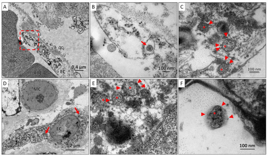 (A). Section of the air-blood barrier in which part of the endothelial cell (EC) and red blood cells (RBC) can be distinguished; SARS-CoV-2 virions were found in the cytoplasm of endothelial cells (red frame); (B). A coronavirus particle (red arrow) was found in the cytoplasm of the endothelial cell; (C). At high magnification, SARS-CoV-2 virions were characterized by a spherical shape, with an average size of 100 nm, surrounded by a membrane, on the surface of which there are electron-dense outgrowths of the S-protein (arrowhead), and granular nucleocapsid structures (asterisks); (D). A region of the vascular glomerulus of the kidney with mesangial (MC) and endothelial (EC) cells, in the cytoplasm of which SARS-CoV-2 virions are found closer to the nucleus (red arrows). (E,F). At high magnification, SARS-CoV-2 virions were characterized by a spherical shape, with an average size of 100 nm, surrounded by a membrane, on the surface of which there are electron-dense outgrowths of the S-protein (arrowhead), and granular nucleocapsid structures (asterisks) can be seen in the lumen of the particles.