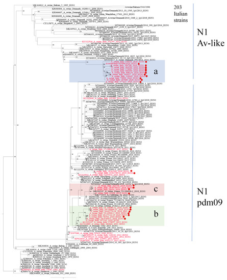 Phylogenetic tree of 199 N1 sequences (1373 nucleotides) of strains sequenced in this work analyzed with 442 representative swine and human N1 sequences, collected from 2009, retrieved from Genbank; the closest NA sequences matching strains in sub-clusters a, b and c are included. Italian sequences are in red with dots highlighting recent strains (2017–2020). The three main sub-cluster (a–c) are highlighted in light blue, green, and pink, respectively. To simplify visualization, a group of 203 Italian N1 strains related to the Eurasian avian-like N1 gene A_swine_Bakum_3543_1998 have been collapsed into one branch. Bootstrap values under 70% are not shown; scale bar represents number of nucleotide substitutions per nucleotide site. Sequences retrieved from Genbank are identified by their accession number.