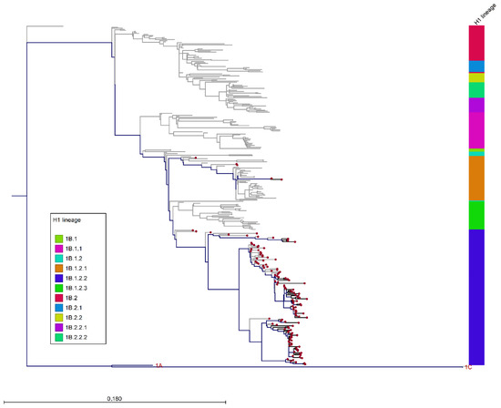 Recently, a new H1 nomenclature was proposed to better classify universally H1 lineages: the HA-1A classical lineage, which also includes the H1N1pdm09 lineage, related to the 1918 human influenza pandemic; HA-1B human seasonal lineage; and the HA-1C Eurasian avian lineage [8]. These three major lineages were further divided into second-, third-, and fourth-order clades.