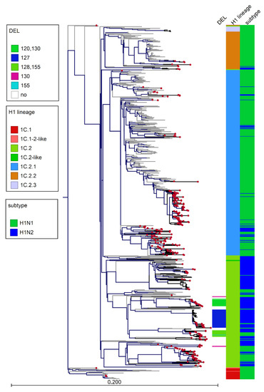 The genetic analysis of the circulating H1avN1 viruses showed an increased variability with respect to the situation described in 2015 [19], since multiple variants of H1C were detected. Different sub-clusters, grouped in the 1C.2 lineage with German and Danish strains, in combination with both N2 and N1 genes, have been identified since 2019 (Figure 6). Moreover, in this lineage, five different patterns of deletion in the receptor binding site region [35] were identified according to H1 numbering [36]: Δ127 (n = 13), Δ130 (n = 2), Δ120,130 (n = 17), Δ128,155 (n = 15), and Δ155 (n = 1).