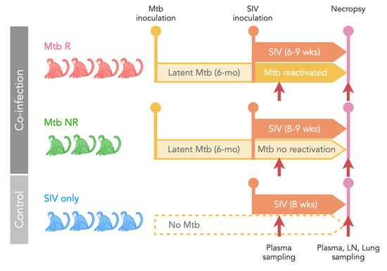 - Diedrich, C.R.; Mattila, J.T.; Klein, E.; Janssen, C.; Phuah, J.; Sturgeon, T.J.; Montelaro, R.C.; Lin, P.L.; Flynn, J.L. Reactivation of Latent Tuberculosis in Cynomolgus Macaques Infected with SIV Is Associated with Early Peripheral T Cell Depletion and Not Virus Load. PLoS ONE 2010, 5, e9611. [Google Scholar] [CrossRef] [PubMed]