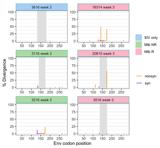 The following are available online at https://www.mdpi.com/article/10.3390/v14010048/s1, Figure S1: Diversity of a cDNA clone of SIVmac251 env, Figure S2: Diversity of the challenge virus (SIVmac251) from this study (SIV-Mtb) and the Ita et al. study, Figure S3: Changes in diversity of SIV env over the course of infection from this study and the Ita et al. study, Figure S4: The estimated SIV diversity by the GLMM (blue, round) and the observed average diversity (red, diamond), Figure S5: SIV diversity in granuloma vs. non-granuloma tissues. Figure S6: Observed insertion and deletion mutations in the SIVmac251 challenge stock used in this study, Table S1: Animal IDs and sample information used in this study, Table S2: SIV Viral RNA copy numbers and CD4+ T-cell information for samples used in this study, Table S3: Results from the generalized linear mixed model on SIV diversity, Table S4: SIV env substitutions observed in this study that were previously reported.