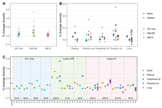 We compared SIV diversity between the three cohorts in the plasma and in all tissue types. The comparison showed that, overall, the samples from the non-reactivator (Mtb NR) cohort had slightly higher average diversity than those from the other two cohorts, though none of the comparisons were statistically significant by Mann–Whitney test (adjusted p-values = 0.179 (Mtb NR vs. Mtb R), 0.217 (Mtb NR vs. SIV only), 0.99 (SIV only vs. Mtb R), Figure 5A). Comparing the average SIV diversity between the cohorts for different tissues followed a similar trend: Slightly higher average diversity in the non-reactivator (Mtb NR) cohort was observed in all tissue types, with the exception of lung tissue, in which the diversity level was reversed, and non-reactivator had the lowest average diversity (Figure 5B, none were statistically significant, Mann–Whitney test, adjusted p-values ranged 0.86–1). When focusing just on the tissues (regardless of treatment group), slightly higher average diversity was observed in thoracic LNs than others, though again, the results were not statistically significant (Mann–Whitney test, adjusted p-values ranged 0.66–1) (Figure 5B).