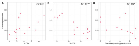 Relationships between SIV diversity and the frequency of CD4+ T cells (A), the frequency of CD8+ T cells (B), and the frequency of CD8+ T cells expressing granzyme B (C) in lung granuloma samples of the Mtb R cohort. Asterisks denote * for p-value < 0.05, ** for <0.01.