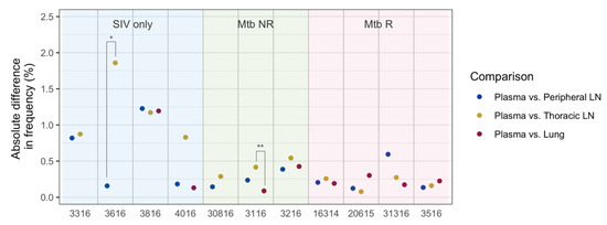 Differences in nucleotide mutation frequencies between plasma and tissues at necropsy in each animal. Frequency differences were calculated from the relatively high frequency sites (>0.8%) for the given animal. Each dot represents a median absolute difference in frequencies. Asterisks (*) indicate statistical significance by the Mann–Whitney test (* = an adjusted p-value < 0.05, ** = an adjusted p-value < 0.01).