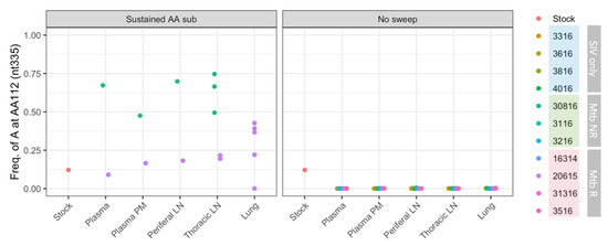 The R112K substitution (nucleotide G→A mutation) was present in the SIV challenge stock at 12.1%. While the function of this mutation is unknown, we are reporting it here because of the surprising frequency changes in two animals (Figure 8). The mutation was undetectable in nine of the animals (82%) and did not become detectable in any samples in these animals (all observed frequencies below the cutoff threshold of 0.5%). In two co-infected animals, 20615 (Mtb R) and 30816 (Mtb NR), the mutation remained detectable. In 20615, the mutation was sustained at a frequency close to that of the SIV challenge stock. In 30816 on the other hand, the mutation became the majority in the viral population at week 5 post-infection, and was found at a high frequency across all tissue types at week 8 post-infection.
