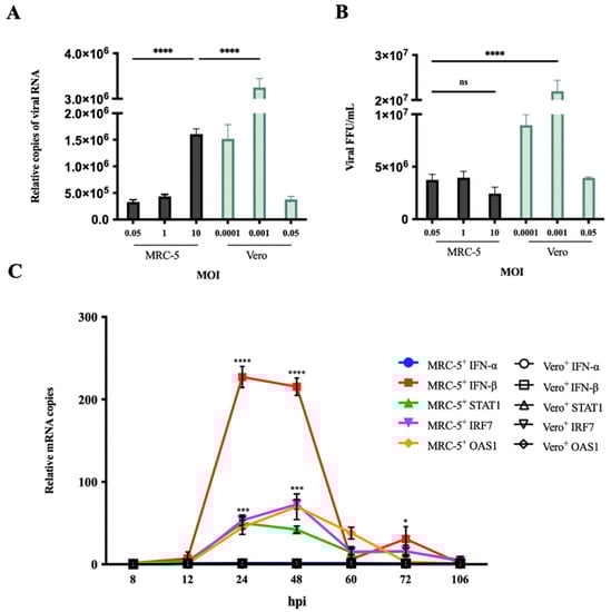 To determine the difference in RABV production between MRC-5 cells and Vero cells, MRC-5 cells were infected with the PM RABV strains (adapted for replication in MRC-5 cells) at MOI values of 0.05, 0.1, 0.5, and Vero cells were infected with the aG RABV strains (adapted for replication in Vero cells) at MOI values of 0.0001, 0.001, and 0.05. The viral RNA and titer in the culture supernatant were tested by qRT-PCR and FFU assays at 168 h post infection (hpi) (Figure 1A,B). The results showed that MRC-5 cells had a significant reduction in RABV production compared with Vero cells. The viral titer in Vero cells reached its maximum at an MOI of 0.001 and was 10-fold higher than that of MRC-5 cells. Infection in MRC-5 cells at an MOI of 10 showed a significant increase in viral RNA expression but not a significant increase in viral titer. These results indicate that an enhancement of RABV production cannot be achieved by an increase in MOI. RABV MOI of 0.05 in MRC-5 cells and an MOI of 0.001 in Vero cells were determined to be the optimum MOI values for use in the following experiments. Additionally, the expression of IFN-α, IFN-β, and IFN signaling pathway endogenous genes, including STAT1, IRF7, and OAS1 in RABV-infected MRC-5 and Vero cells, was examined by qRT-PCR at 8 to 106 hpi, respectively (Figure 1C). The expression of these genes in MRC-5 cells was significantly upregulated compared with that in Vero cells at 24 and 48 hpi. Notably, IFN-β mRNA expression in MRC-5 cells showed a 200% increase compared to that in Vero cells. The IFN-α mRNA expression was not observed. This may be due to the fact that RABV, as a single-stranded RNA virus, enters cells and is mainly recognized by RIG-I, which can activate the expression of IFN-β [,]. These results suggest that the activation of the IFN signaling pathway genes acts as a crucial limiting factor to affect RABV production in MRC-5 cells. Inhibiting the activation of IFN response may be an effective approach to enhance RABV production in MRC-5 cells.
