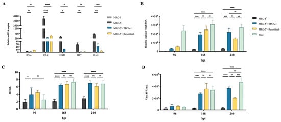 Two small molecules, nuclear factor kappa-B kinase-2 inhibitor, TPCA-1, acting on IFN-β promoter [], and Janus kinase-1 inhibitor, ruxolitinib, acting on the signal transmission of interferon receptor [], were used to inhibit IFN responses. These inhibitors were incubated with the cells 2 h before viral infection, and then endogenous IFN-α, IFN-β, STAT1, IRF7, and OAS1 mRNA expression were examined by qRT-PCR analysis at 24 hpi (Figure 2A). The MRC-5 cells treated with TPCA-1 or ruxolitinib showed a significant reduction in the mRNA expression of IFN-β, STAT1, IRF7 and OAS1 compared with the untreated cells (Figure 2A), suggesting the effectiveness of the inhibitor. Subsequently, the viral RNA, antigen G concentration, and RABV titer in the culture supernatant were measured by qRT-PCR, ELISA, and FFU assays at 96, 168, and 240 hpi [], respectively (Figure 2B–D). The results showed a significant enhancement in viral RNA, G concentration, and titer at 168 and 240 hpi compared with the untreated cells, indicating an increase in RABV production. There was no significant difference in RABV production between MRC-5- and Vero-infected cells. These results confirm that IFN response is an important limiting factor of RABV production. Inhibiting the activation of IFN response can enhance RABV production in MRC-5 cells.