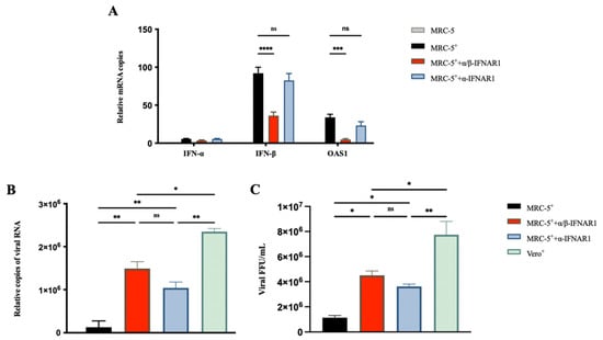 The IFN-α/β receptor IFNAR1 mAbs α/β-IFNAR1 and α-IFNAR1 [] were used to confirm the inhibition of RABV production by IFN in MRC-5 cells. The α/β-IFNAR1 mAb binds to both IFN-α and the IFN-β binding domain of IFNAR1, whereas α-IFNAR1 mAb only binds to the IFN-α binding domain. The antibodies were incubated with cells 2 h before viral infection, and then endogenous IFN-α, IFN-β, and OAS1 mRNA expression was examined by qRT-PCR at 24 hpi. The MRC-5 cells treated with α/β-IFNAR1 mAb showed a 60% reduction in the expression of IFN-β mRNA and an 80% reduction in the expression of OAS1 mRNA compared with the untreated cells (Figure 3A). On the contrary, the treatment of α-IFNAR1 mAb did not affect the expression of OAS1, as the virus infection did not activate the expression of IFN-α (Figure 3B). Additionally, the viral RNA and titer at 168 hpi in the culture supernatant were tested by qRT-PCR and FFU assays. The MRC-5 cells treated with α/β-IFNAR1 mAb showed a significant enhancement in RABV production (Figure 3B,C). α-IFNAR1 mAb treatment also showed an enhancement in RABV production. These results also indicated that the production of RABV is significantly enhanced in MRC-5 cells by the inhibition of IFN signaling pathway gene expression.