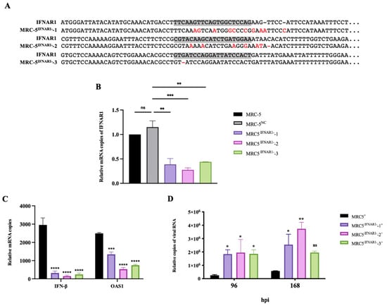 RABV production was enhanced in MRC-5IFNAR1− cells. (A) Genomic DNA from three MRC-5IFNAR1−: gRNAs cell lines was extracted. The target sequence was amplified by PCR with IFNAR1 gRNA MRC-5IFNAR1−-1,2,3 primers in Table 4 and then was sequenced. The deficiency of IFNAR1 in three MRC-5IFNAR1− cell lines were confirmed by sequencing trace analysis. The gRNA target area is marked in gray. Mutated bases are marked in red, and—means deletion. (B) Three MRC-5IFNAR1− cell lines, MRC-5NC, and MRC-5 cells were cultured in 6-well plates to 80% confluence. Total RNA from cells was extracted, and the expression of IFNAR1 mRNA was detected by qRT-PCR. (C) Three MRC-5IFNAR1− cell lines and MRC-5 cells were cultured in 6-well plates to 80% confluence. The cells were infected with the PM RABV strain at an MOI of 0.05. The total RNA from cells was extracted at 24 hpi, and the expression of IFN-β and OAS1 mRNA was detected by qRT-PCR. (D) Viral RNA in the culture supernatant were detected by qRT-PCR at 96 and 168 hpi. +: Viral infection; NC: non-targeting control; * p < 0.05; ** p < 0.01; *** p < 0.001; **** p < 0.0001; ns p ≥ 0.05 compared with MRC-5+ at the indicated gene or time.