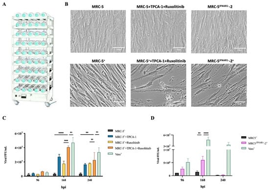 The IFN inhibitor or MRC-5IFNAR1− cell lines enhanced rabies virus (RABV) production in pilot-scale experiments. (A) The pilot production platform consists of 30 spinner flasks with a surface area of 1500 cm2 and a constant temperature flask-rotating machine. The MRC-5IFNAR1− cells and MRC-5 cells treated with both 2 μM TPCA-1 and Ruxolitinib 2 h before RABV infection were infected with the PM RABV strains at an MOI of 0.05 in 1500 square centimeter spinner flasks, respectively. Vero cells were infected with the aG RABV strains at a MOI of 0.001. (B) Representative cell status was recorded at 168 hpi. (C) The MRC-5 cells were treated with 4 μM TPCA-1, 4 μM Ruxolitinib, or both 2 μM TPCA-1 and Ruxolitinib 2 h before RABV infection. Viral titers in the culture supernatant were detected by focus-forming unit (FFU) assays at 96, 168, and 240 hpi. (D) The MRC-5 or MRC-5IFNAR1− cells were infected with RABV. Viral titers in the culture supernatant were detected by FFU assays at 96, 168, and 240 hpi. +: RABV infection; ** p < 0.01; *** p < 0.001; **** p < 0.0001; ns p ≥ 0.05.