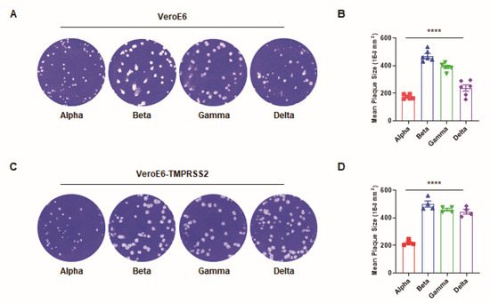 Comparison of the plaque size of four SARS-CoV-2 variants. (A) Representative images of the plaque forming assay for each variant of concern in Vero E6 cells. (B) The mean plaque size (1 × 10−3 mm2) of each variant. (C) The images of the plaque forming assay for each variant of concern in Vero E6-TMPRSS2 cells. (D) The mean plaque size of each variant. All error bars indicate the standard errors of the mean. Mean values for the plaque size were compared using one-way ANOVA in GraphPad Prism 8.0 software. Statistical significance was set at p < 0.05. (****, p < 0.0001).